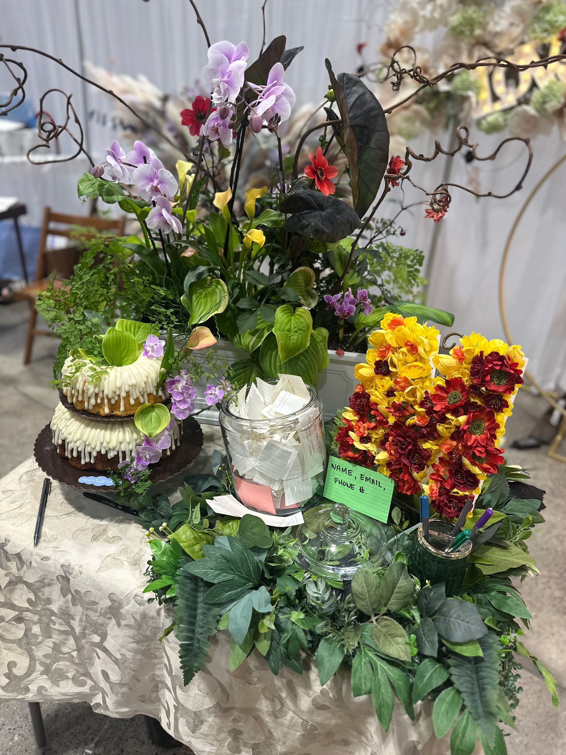 Amazing collaboration with Nothing Bundt Cakes for the KC Bridal and Wedding expo this spring. Did a matching cake and living arrangement. Living arrangements as centerpieces are great because you can save the plants and flowers. Either can go in the ground outside or make great houseplants. I am happy to give instruction on each plant used as well!